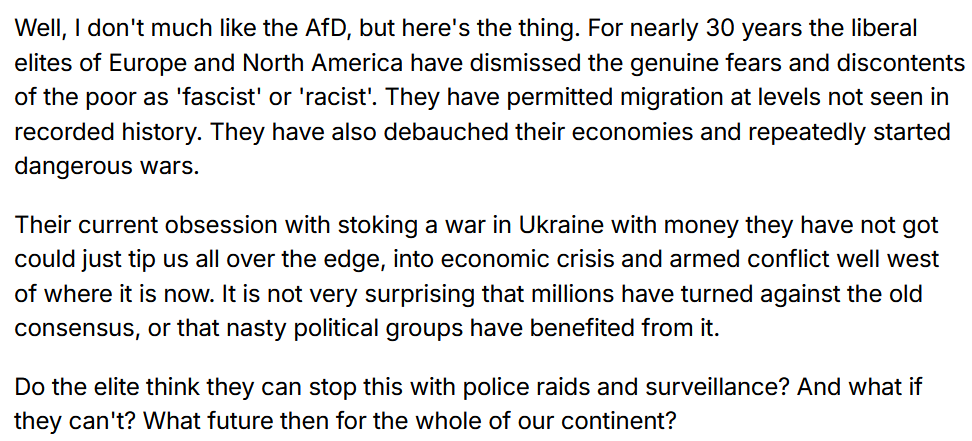 As our nation slides into Apartheid, rural communities are where the British people who flee cities are coming. Increasingly we will become little enclaves of the last of England … ignoring the cities, the Government and the rules, and managing our own affairs. It is already happening.