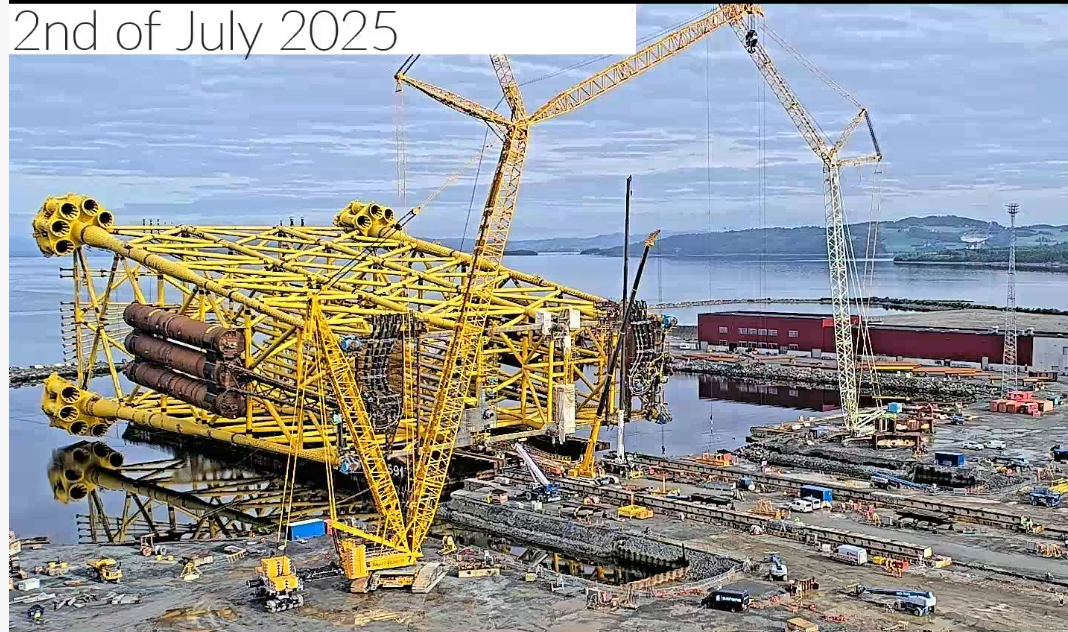 10. Picture of the jacket structure for the project I'm on – the jacket stands on the seabed and supports the process and accommodation. Loadout by sliding it onto the transport barge was at the weekend – quite something, as it weighs more than the Eiffel Tower!