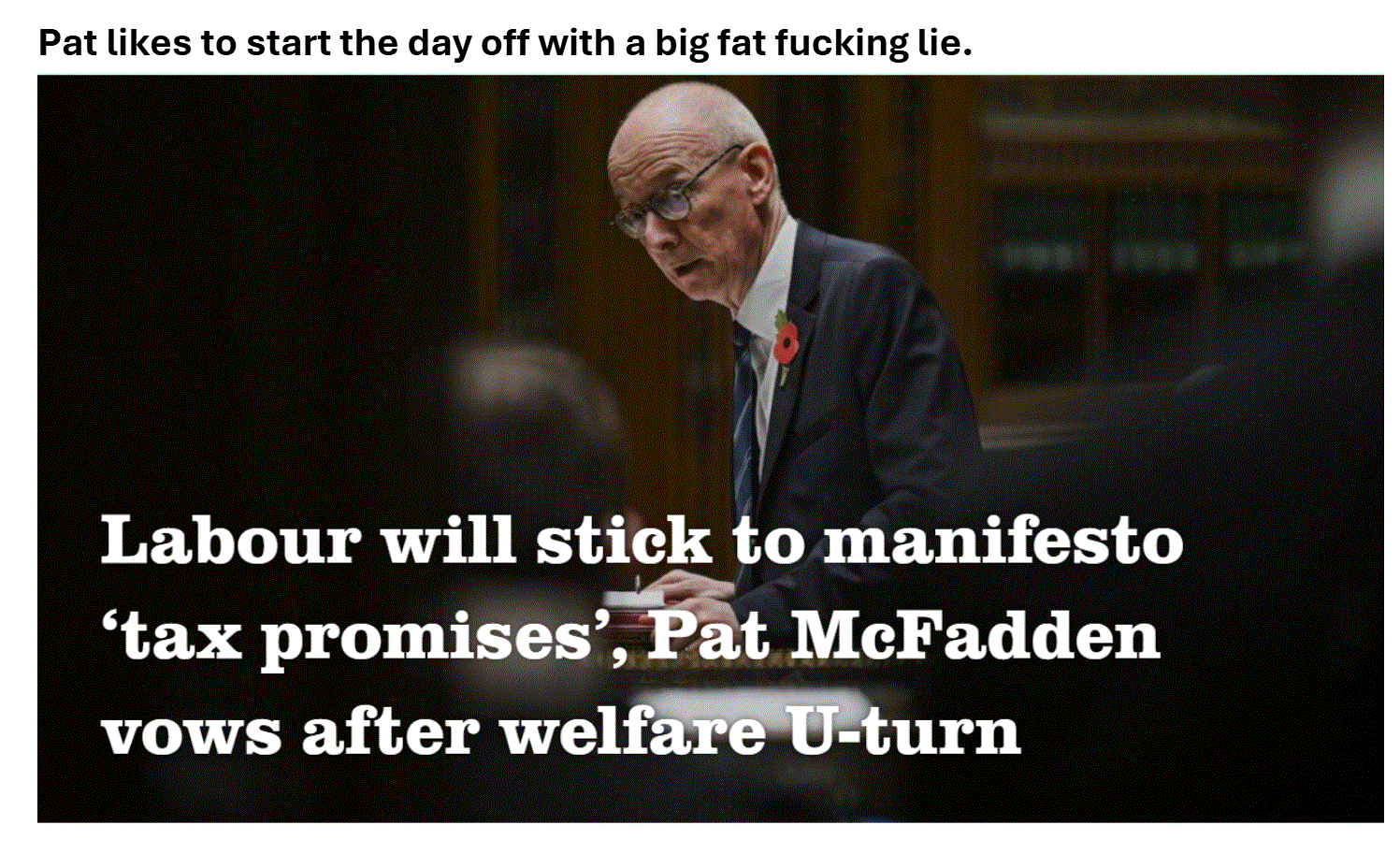 I went to the pub for a carvery on Sunday. Even as recently as Lockdown, I could get a good roast dinner for about £8. Now, it is £18. They say that overheads have shot up as a result of that Labour pledge not to raise "tax" for hardworking people, and they cannot pay for their pet PFI projects by cutting disability welfare, so they had to pile it on overheads for small businesses to pass on to their customers. That way, it is not considered "tax", and pub landlords are not considered "hardworking".